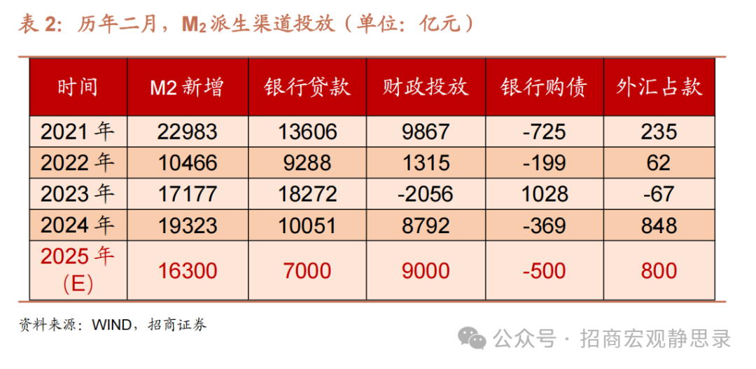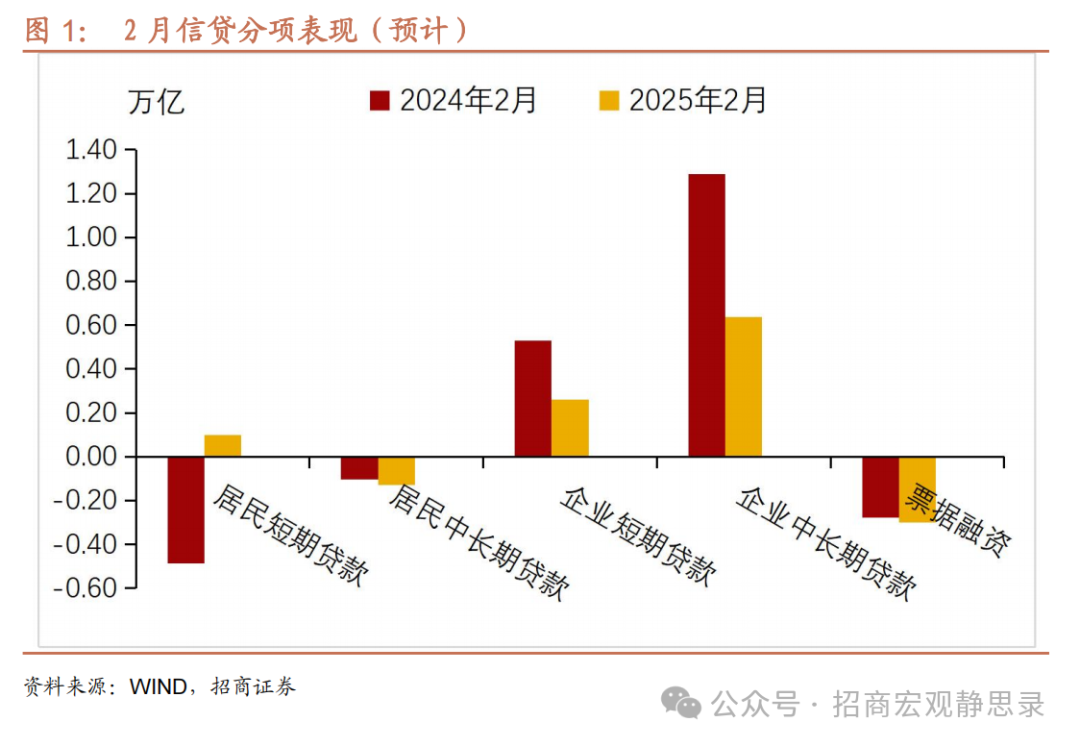 1)预计居民贷款新增约-300亿左右。二月,房地产市场受春节假期影响而降温,保持低位运行;二手房市场量价分化明显,以价换量持续。商品房方面,据克尔瑞数据显示,百强房企实现销售操盘金额1881.2亿元,同比增长1.2%,环比降低17.3%。从地域分布来看,一线城市热度不减,其中深圳一手住宅网签量同比高增150%;二线城市楼市出现回暖,环比回落四成,优于一线城市。存量房方面,全国主要城市二手房成交量基本实现显著增长,其中杭州二手房住宅网签量同比增长220%,上海、杭州、成都和北京住宅网签量接近翻倍,14城二手住宅成交量同比上升八成。结合过去五年同期贷款投放情况(上年同期-1038亿,过去五年同期平均770亿),预计当月居民中长期贷款新增-1300亿元。 居民短期贷款方面,春节的错期效应持续对二月短贷融资意愿产生影响。高频数据显示,当月乘用车日均销量同比增长23.5%,一线城市地铁客运量同比增长15.1%,电影票房同比增长48.2%,国内航班同比微降0.75%,反映出商品消费与服务消费同步火热,而乘用车日均销量同比增长对居民短期贷款更加具有意义。综合上述信息,预计居民短期贷款新增1000亿左右(上年同期约-4868亿,过去五年同期平均-2750亿)。合并来看,预计二月新增居民人民币贷款约在-300亿上下(上年同期约-5900亿,过去五年同期平均约-1980亿)。 2)企业信贷预计新增6000亿上下。二月,制造业PMI反弹到荣枯线之上。结构上,需求指标(新订单指数)与供给指标(生产指数)反弹明显,重新回到荣枯线之上;建筑业PMI也出现较大反弹,回到荣枯线上方,表明经济活动开始走强。但从融资角度来看,当月BCI企业融资环境指数环比回落(47.1→46.7),估计与一月企业信贷透支有关。综上,预计企业实际信贷环比转弱,剔除票据融资后的企业信贷新增约9000亿(上年同期新增1.82万亿,过去五年同期平均约1.37万亿)。 √ 二月,预计社融新增2.2万亿左右,增速8.2% 二月,债强贷弱格局下,社融预计新增2.2万亿(上年同期新增约1.5万亿,过去五年同期平均1.7万亿),增速8.2%。 分项来看: 1)社融口径下的人民币贷款,预计新增7000亿左右(上年同期新增约9800亿,过去五年同期平均1.2万亿)。 2)据WIND数据统计,政府债净融资约1.69万亿(上年同期约6800亿)。其中,国债净融资约4184.7亿(上年同期约2646.7亿),地方债净融资约1.27万亿(上年同期约4132亿)。 3)企业直接融资约1940亿。结构上,企业债券净融资约1875亿(上年同期约167.8亿)。其中,产业债净融资1966.2亿元(上年同期约1266亿),城投债净融资约560亿元(上年同期约-364亿)。企业IPO/增发等募集资金约64.77亿(上年同期约112.9亿)。 4)“非标”融资新增约-3700亿(上年同期约-3300亿),其中未贴现承兑汇票预计减少约4200亿(上年同期约-3700亿)。 √ 预计M2余额环比增加1.63万亿,同比增长约6.9% 根据M2派生途径,预计M2余额环比增加1.63万亿,同比增长6.9%。其中,实体经济信贷派生约7000亿(包括:社融口径下的新增信贷+贷款核销+存款类金融机构资产支持证券),财政净投放派生约9000亿,其它因素(银行自营购买企业债、央行外汇占款等)合计派生约300亿上下。 国内外经济基本面变化超预期;宏观政策超预期 本文来源于微信公众号“招商宏观静思录”;智通财经编辑:文文。