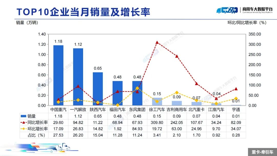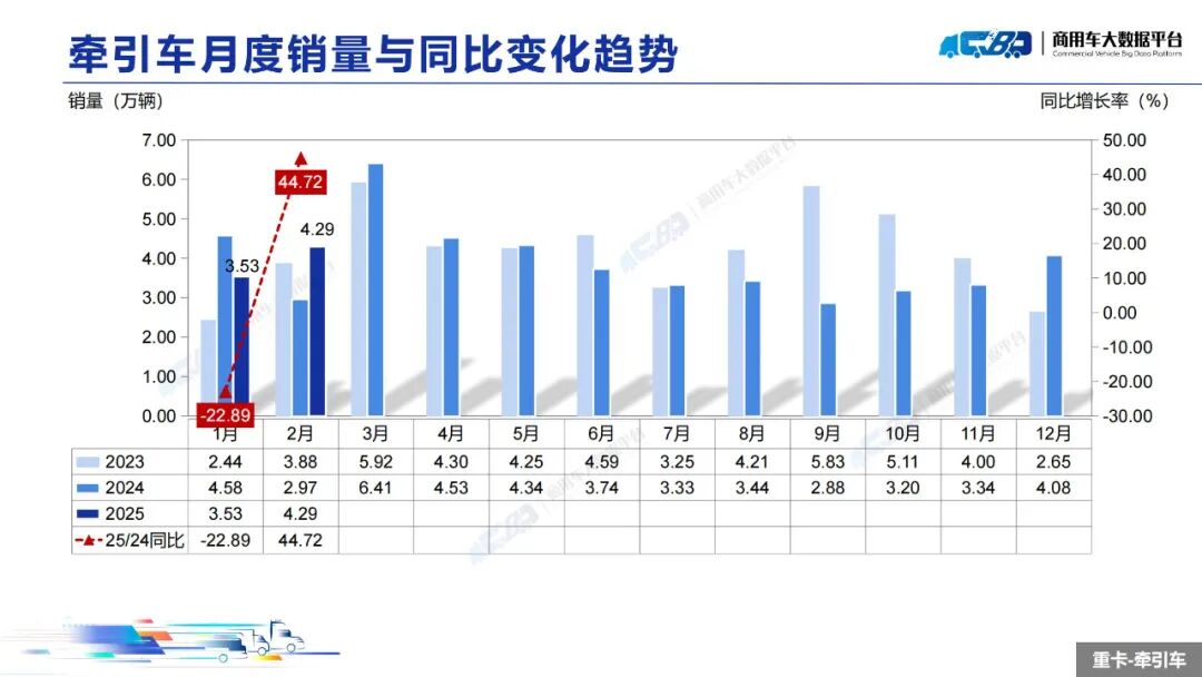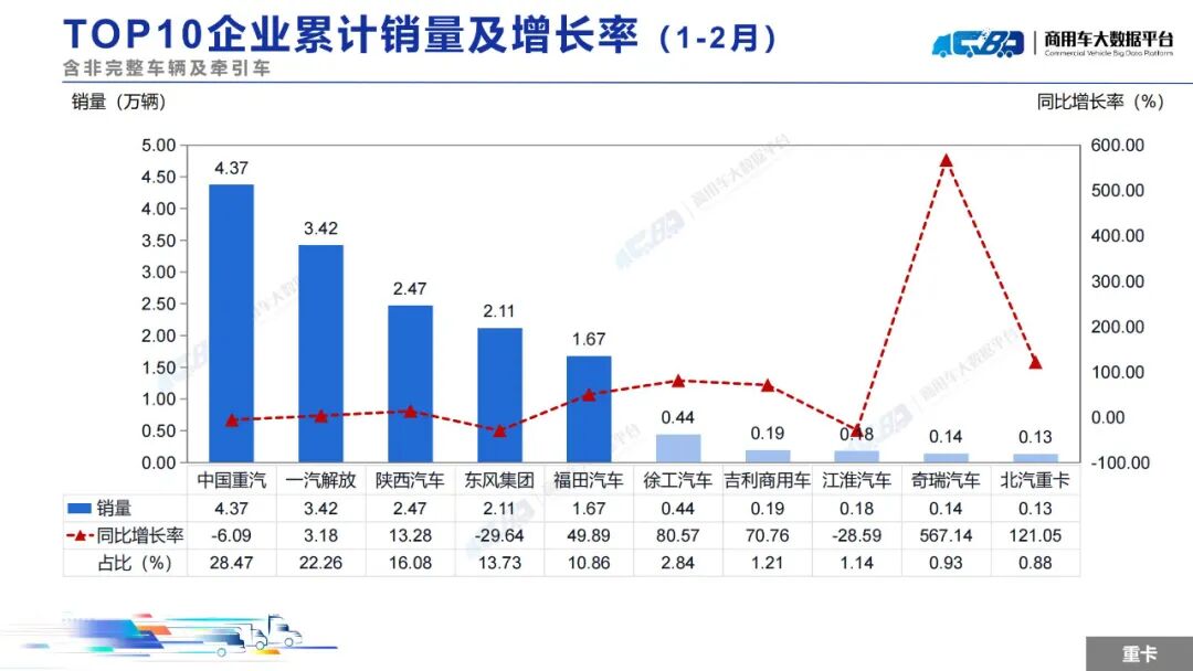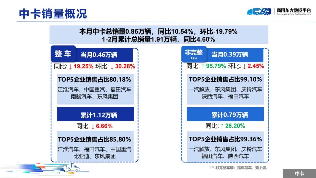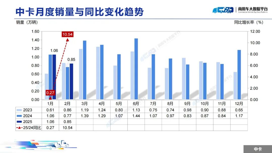 智通财经APP获悉,近日,中国汽车流通协会商用车专业委员会发布2025年2月中重型卡车销量月度形势分析报告。报告称,2025年2月全国重型卡车销量(批发)为8.14万辆,同比上升36.09%,环比下降上涨12.74%;中型卡车销量(批发)为0.85万辆,同比上涨10.54%,环比下降19.79%。1-2月,全国重型卡车销量(批发)为15.35万辆,同比下降1.99%;中型卡车销量(批发)为1.91万辆,同比上涨4.60%。