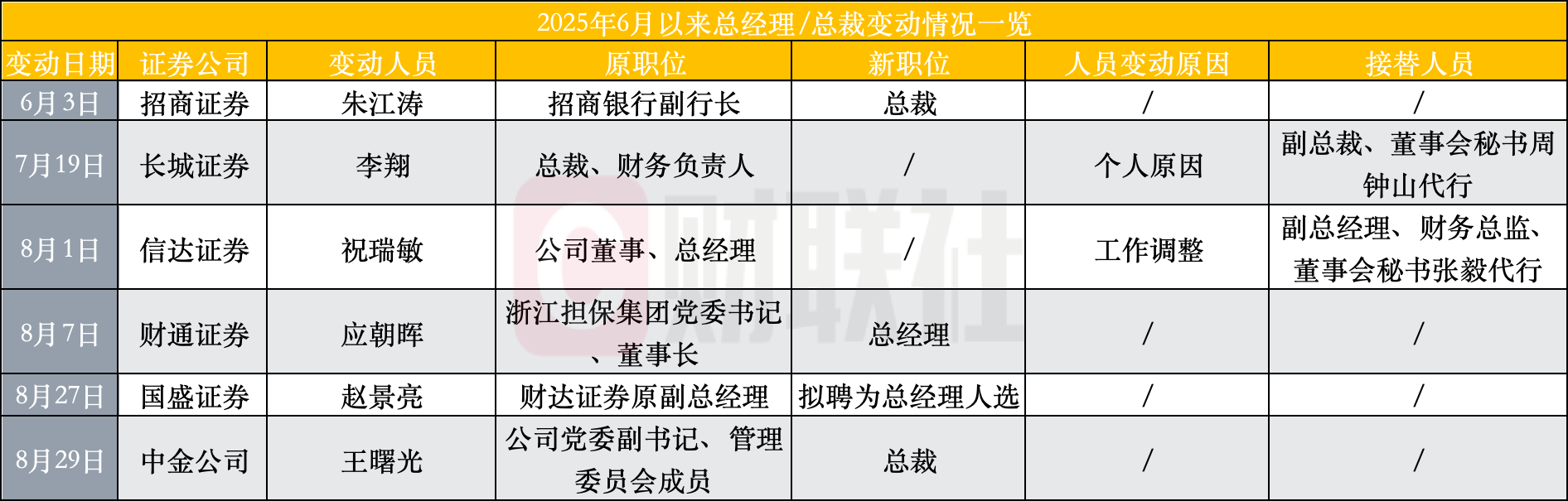 在近期券商行业高管密集调整的大背景下,总经理 / 总裁变动则相对稳定。据不完全统计,6月至今,共6家券商涉及总经理/总裁职位调整,变动频率显著低于其他高管层级。