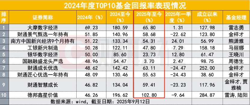 经历过年初的业绩回撤,这些基金没有浪费牛市机会,再次跟上了市场的节奏,以去年的冠军基大摩数字经济为例,2024年全年收益率69.23%,截至今年9月12日,2024年以来回报率达到180.59%。