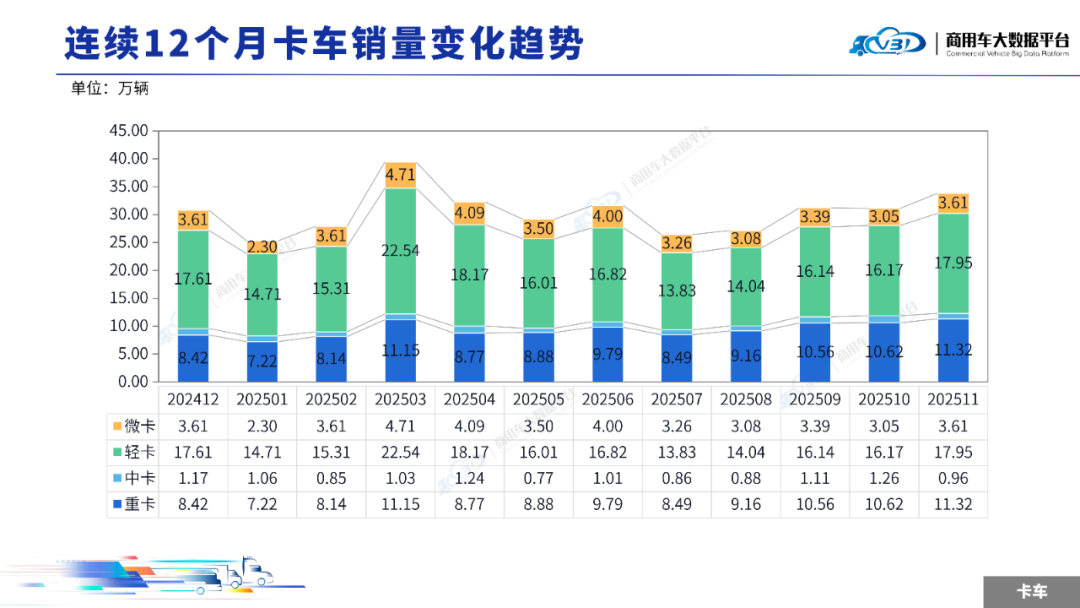 2025年11月卡车销量(批发)为33.84万辆,同比增长25.90%,环比增长8.79%;1-11月卡车累计销量(批发)335.40万辆,同比增长10.17%。