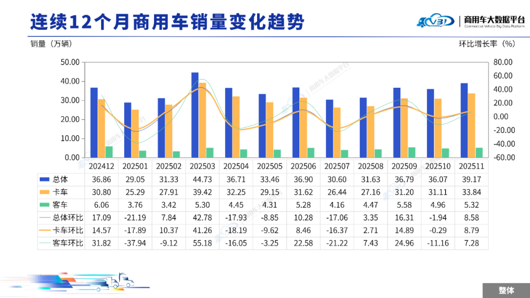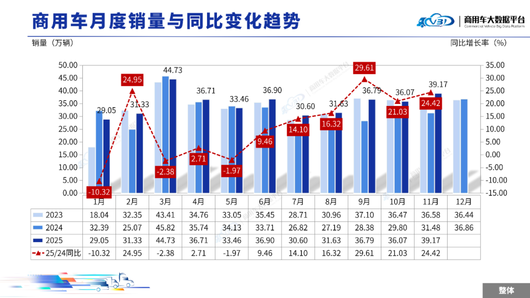 2025年11月全国商用车整体销量(批发)为39.17万辆,同比增长24.42%,环比增长8.58%;1-11月全国商用车累计整体销量(批发)为386.41万辆,累计同比增长10.24%。