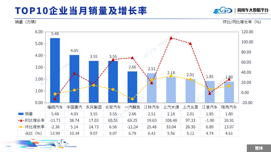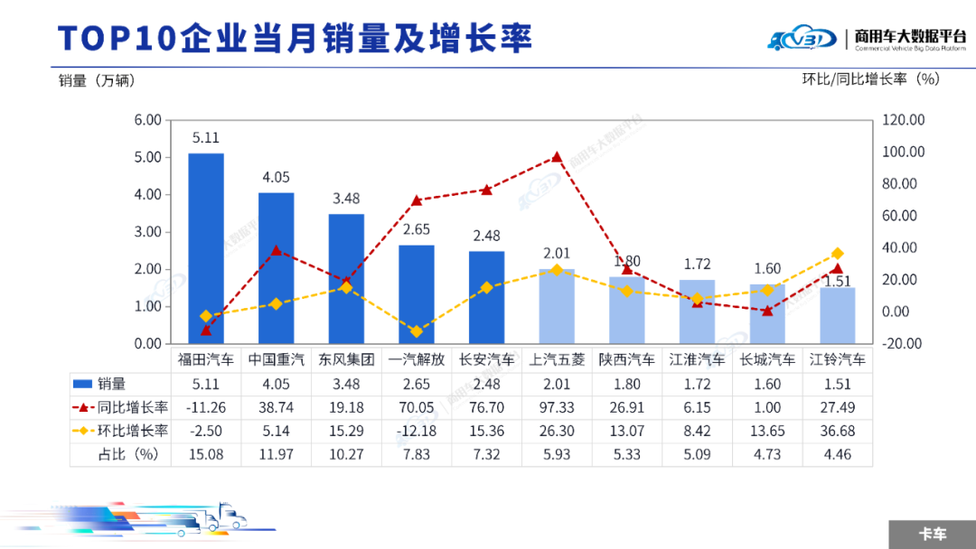 当月TOP5企业销量占比为49.26%,依次为福田汽车、中国重汽、东风集团、长安汽车、一汽解放。