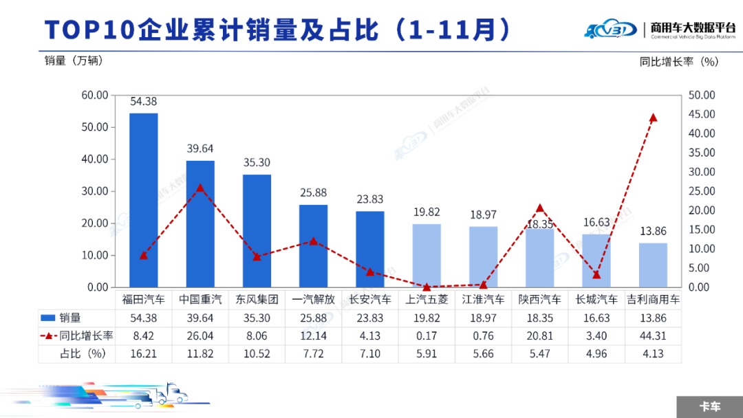 1-11月累计TOP5企业销量占比为50.70%,依次为福田汽车、中国重汽、东风集团、长安汽车、一汽解放。