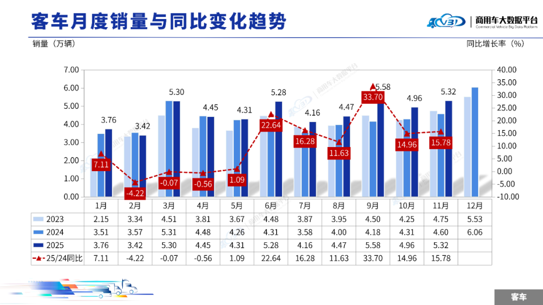 2025年11月客车销量(批发)为5.32万辆,同比增长15.78%,环比增长7.28%;1-11月客车累计销量(批发)51.01万辆,同比增长10.67%。