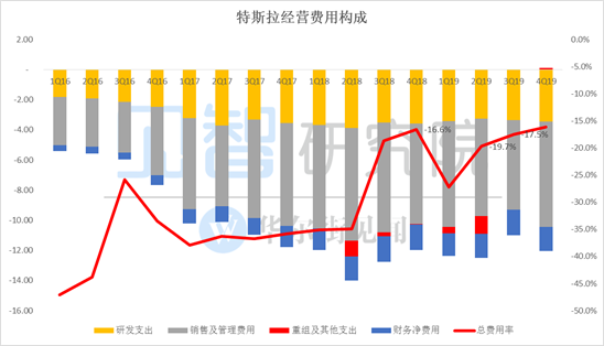 Q4,特斯拉的总经营费用率同比下降了0.5个百分点至16.1%,环比上个季度则下降了1.4个百分点。