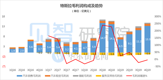 19Q4,特斯拉共实现毛利润13.9亿美元,环比增长16.8%,同比下降3.6%。