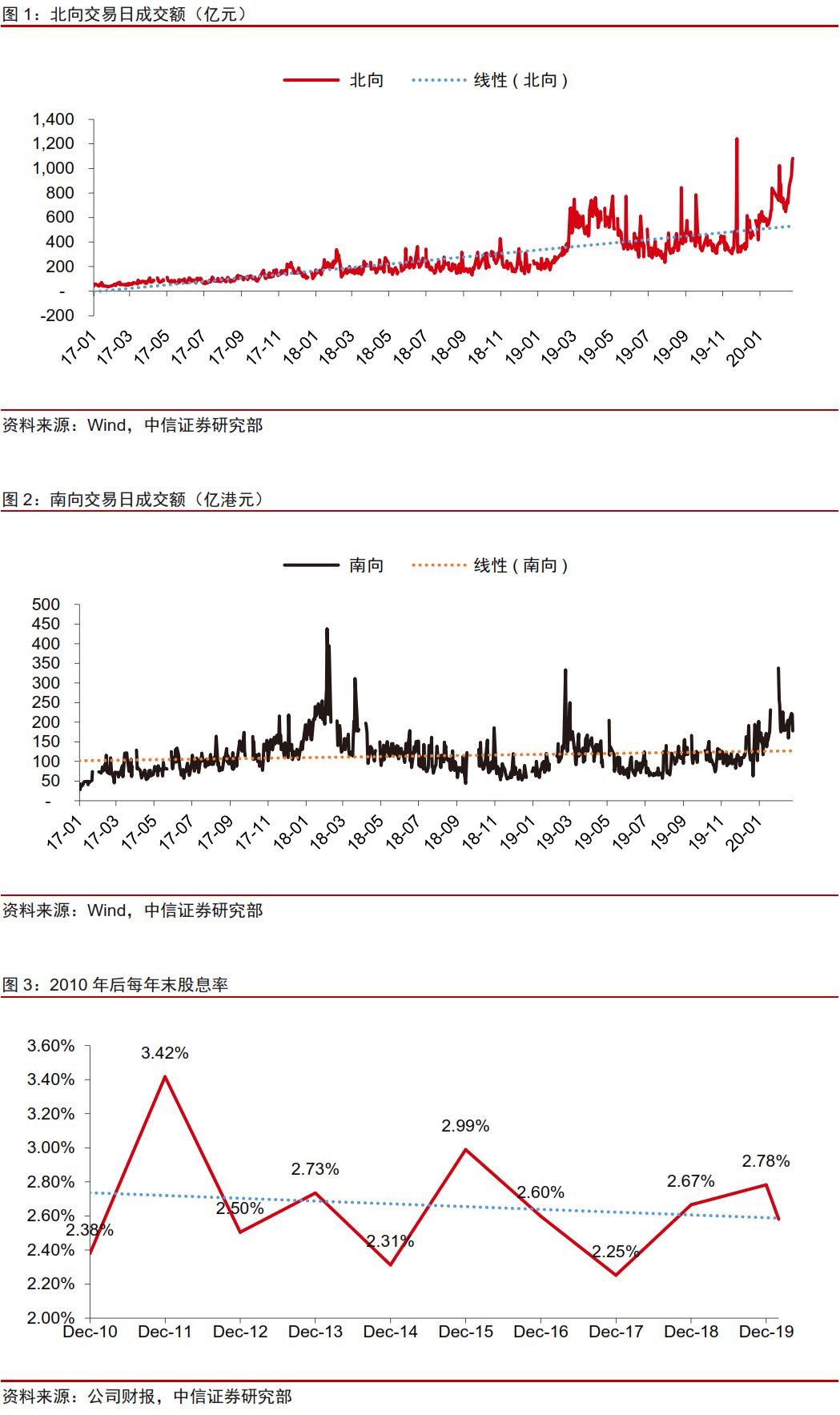 北向交易有望持续受益于国内流动性宽松,南向受美团(03690)小米(01810)纳入带动明显。2019年沪深港通收入占比7.4%,较2018年提升2.6pcts。北向资金自2019年1月以来持续活跃,特别是2019年11月以来日成交额自429亿人民币提升至1082亿人民币,预计仍将受益于国内流动性宽松。南向交易虽然2019年ADT略降至109亿港元(2018年127亿港元),但自2019年10月末美团和小米纳入港股通后,日成交额也已自107亿港元提升至178亿港元。预计随着更多中概回归及新经济独角兽上市,南向ADT中枢有望稳步提升。