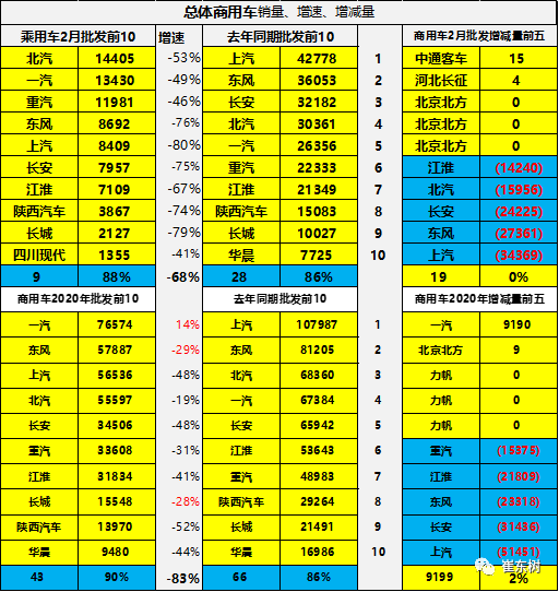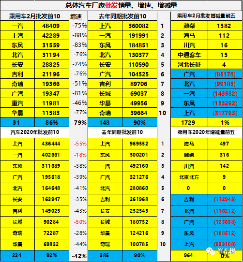 2020年2月车市相对低迷,主力厂家大部分出现下滑。