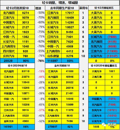 20年累轻卡销量16.19万台,累计增速-41.3%;2月销量2.85万台,同比增长-75.9%,环比增长-78.6%。