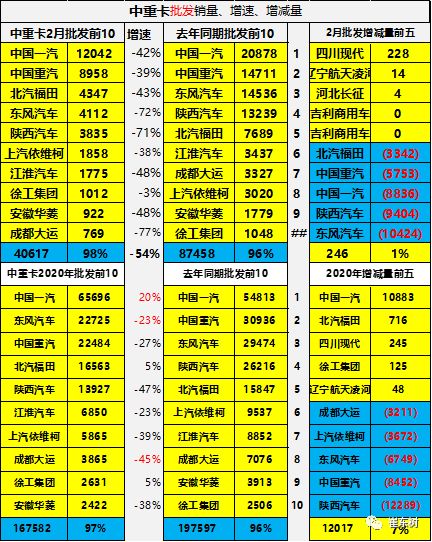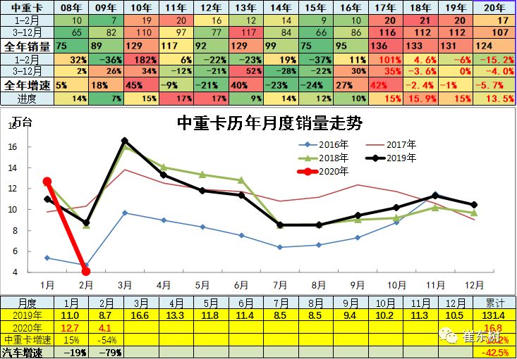 20年累中重卡销量16.76万台,累计增速-19.3%;2月销量4.06万台,同比增长-53.6%,环比增长-68%。