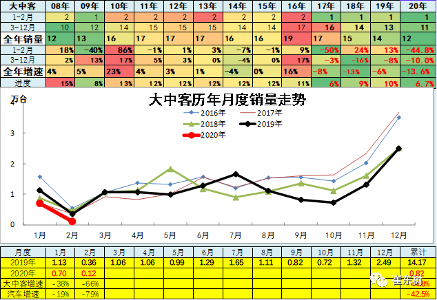20年累大中客销量0.82万台,累计增速-45.6%;2月销量0.12万台,同比增长-66.3%,环比增长-82.8%。