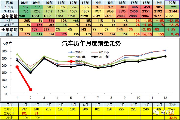 2020年2月,中国汽车产销量分别为28.5万辆和31万辆,较去年同期分别下滑79.8%和79.1%。2月销量下滑主要是由于公共卫生事件带来的负面影响,企业生产水平较低,同时消费需求受到了严重抑制。
