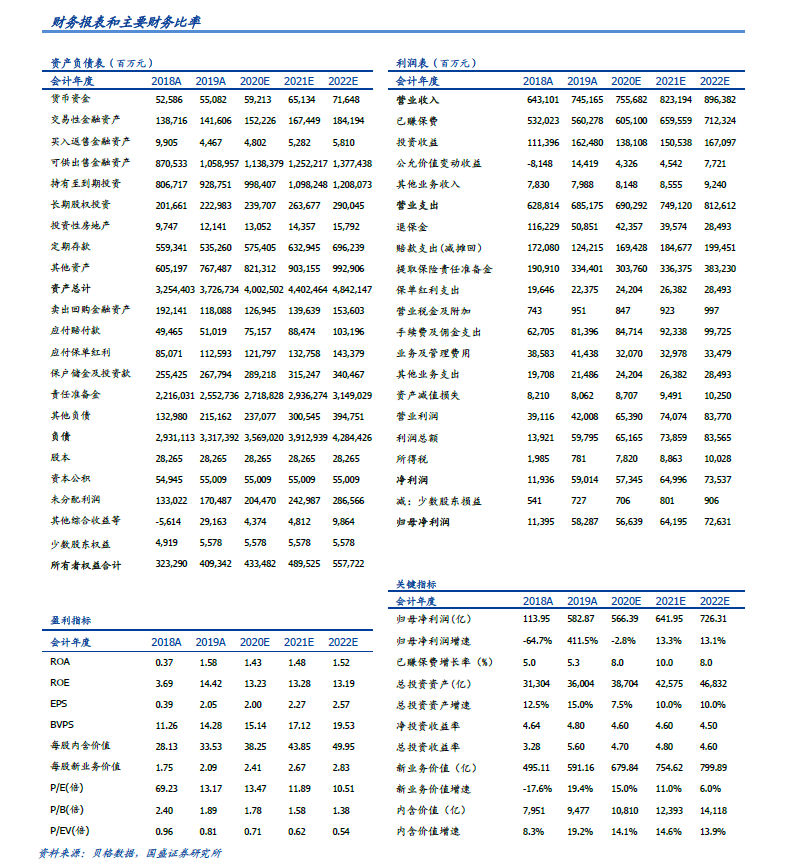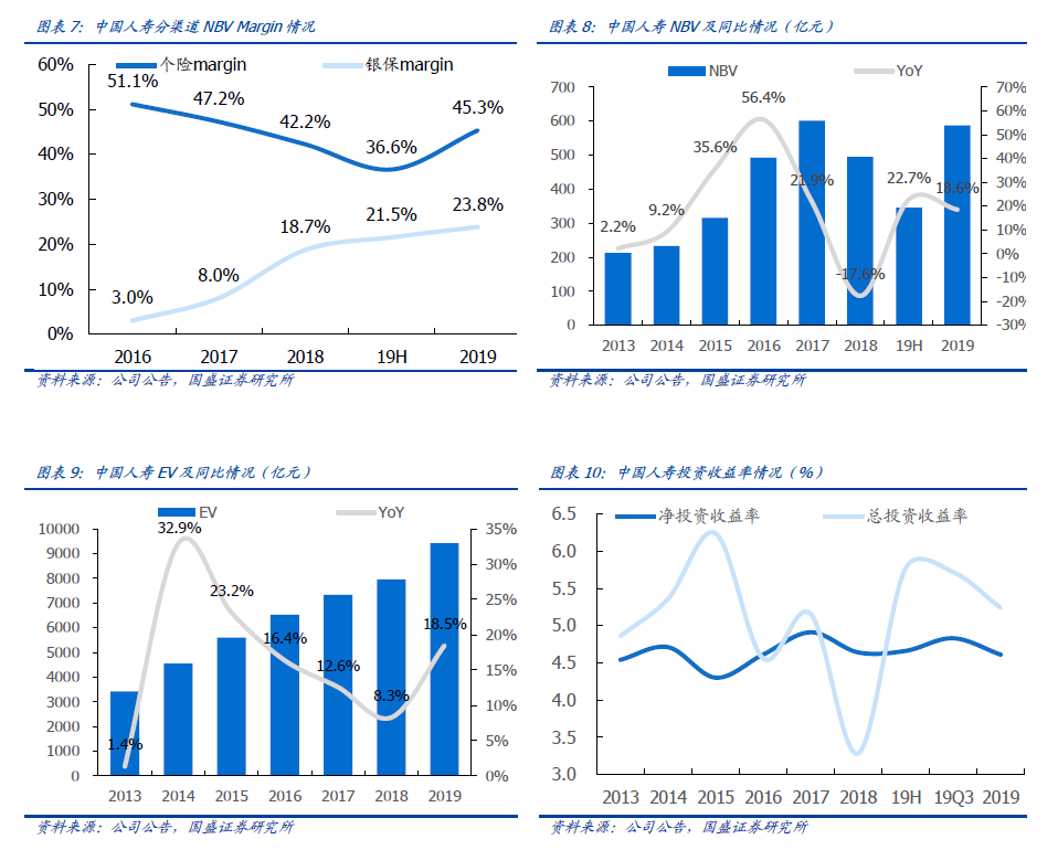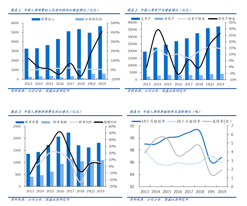 负债端保持高增长,核心指标增长趋势均明显优于同业。2019年全年公司负债端表现持续优于同业,NBV全年增长18.6%至586.98亿元,在新单保费实现5.9%正增长的同时,整体保单质量有所改善,首年期缴前十大主销产品中6款为保障型产品,个险margin提升3.1个百分点至45.3%,银保margin提升5.1个百分点至23.8%。公司退保率同样显著优化,同比下降2.8个百分点至1.9%,在“重振国寿”的战略指引下实现做强做优,此外“鼎新工程”也基本完成了组织架构优化和人员调整。我们预计在受公共卫生事件影响的当下,公司全年仍然能够实现新单保费及NBV的正增长,延续优于同业的负债表现。