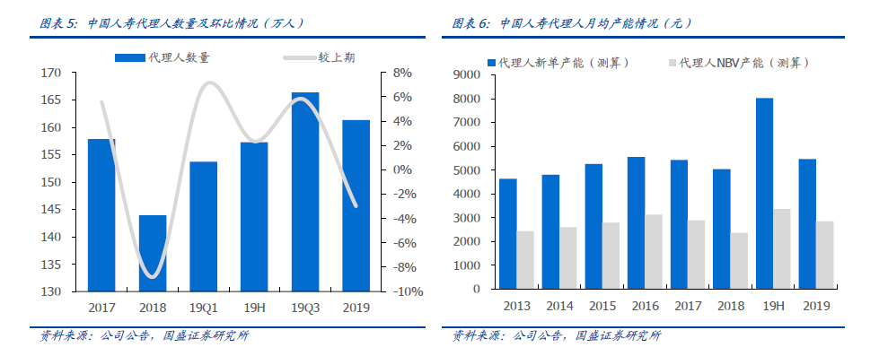 人口红利末期实现代理人“扩量提质”,全年代理人增长12.1%,同时产能显著提升:在行业代理人整体增速承压的背景下,2019年底公司代理人161.3万人,较2018年底增长12.1%;测算下代理人月均新单及NBV分别为5458元、2850元,同比增长8.2%、20.4%,代理人“扩量提质”策略获得体现。