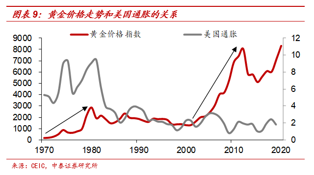 但将时间拉长了看,发现金价和美元指数之间并没有什么相关性。例如在美国大稳健时代的十几年里,美元指数几次大起大落,而黄金价格却走势平平。再比如,2005-2012年间美元指数震荡走平,但黄金价格却上涨了3倍多。近期美元维持强势,但依然没有阻挡住黄金的大涨。