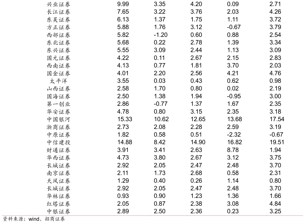 利润规模格局稳定,ROE表现分化加剧。从归母净利润较度看,中信(41亿)、华泰(06886)(29亿)、海通(06837)(23亿)、广发(01776)(21亿)、申万(06806)(20亿)位居行业前五。38家上市券商一季度平均ROE1.82%,年化后为7.27%。建投(06066)(3.98%)、红塔(3.54%)、华林(3.06%)、国信(2.62%)、一创(2.56%)位居行业前五,年化后ROE均超10%。同时有六家券商一季度ROE不足1%。
