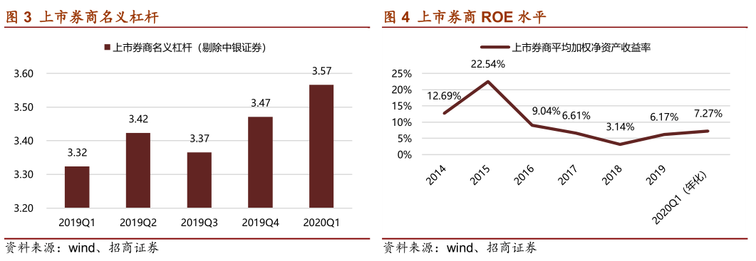 名义杠杆倍数环比继续提升。名义杠杆倍数较2019年末提升0.1至3.57倍,目前杠杆水平处于高位。一季度权益市场大幅波动对券商ROA产生负面拖累,上市券商平均净资产收益率1.82%,年化后为7.27%,依然处于近年来相对高位。