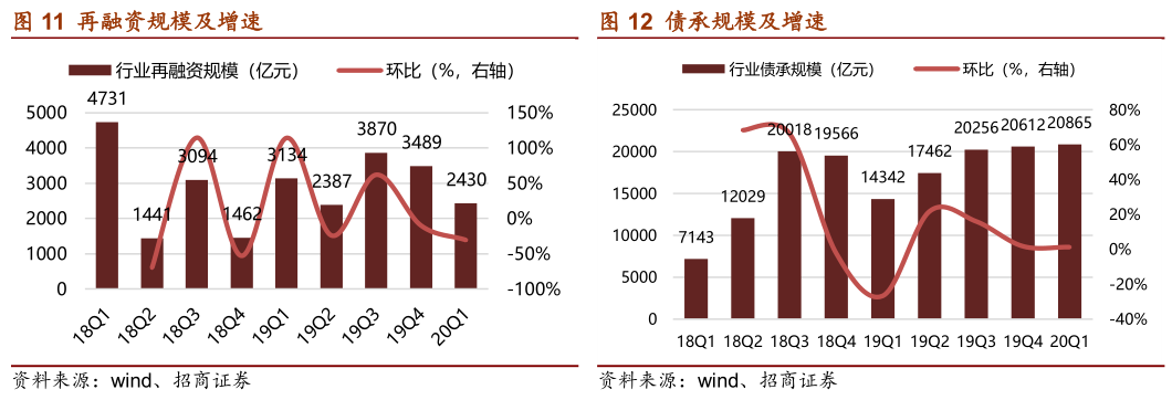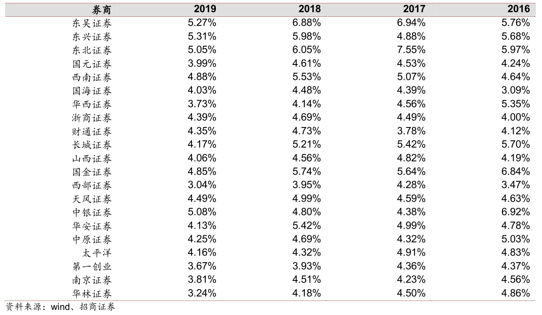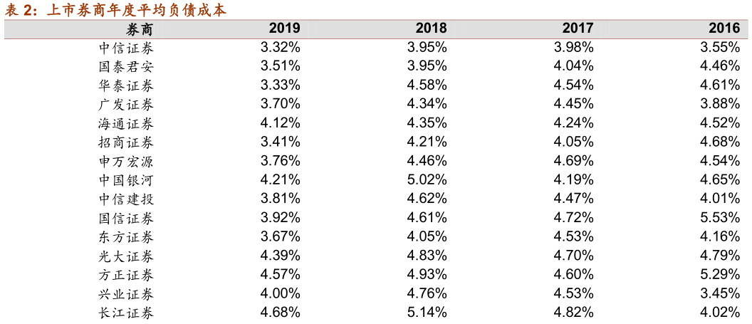 资金成本走低是主要因素。(1)负债成本继续走低。2018年以来,证券公司发债成本持续下降驱动总体负债成本降低。其中大型券商成本优势更大,2019年前十券商平均负债成本3.71%,总体上市券商为4.18%。今年一季度,证券公司新发债券规模达3457亿,为单季度之最;同时平均利率水平进一步下探至2.79%,进一步驱动证券公司资金成本走低。(2)市场收益率股、债分化。今年一季度,上证综指-9.8%,去年同期+24%;中证全债指数+4.4%,去年同期+2.2%。(3)科创板跟投收益影响逐步体现。截至最新35家券商参与科创板跟投,累计浮盈153亿,收益率达134%。(4)传统收费类业务竞争依然激烈,费率趋向于成本定价。预计投行、经纪以及资管各项费率继续稳中略有下降。