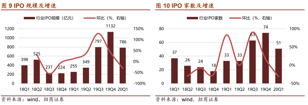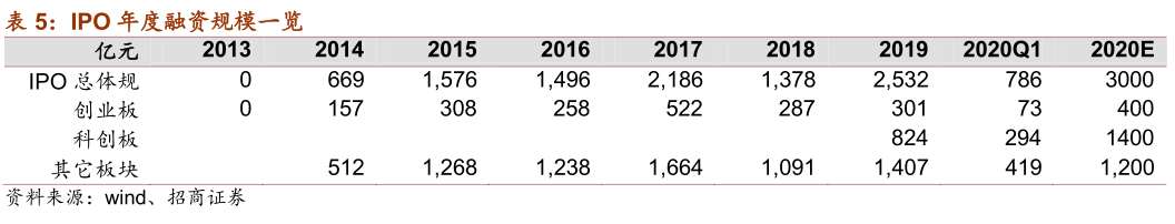 展望2020年全年,我们看好在改革深化背景下,股权融资规模的明显增长。(1)预计IPO全年融资规模3000亿元左右,同比+18%。其中,全年科创板融资规模与目前节奏保持一致,IPO融资规模达1400亿元。。改革驱动下,创业板IPO规模达400亿元左右,同比+30%。其它板块规模IPO规模相对收缩至1200亿元。(2)再融资新政下,全年融资规模达到1.5万亿,同比+17%,回到2017年水平。基于上述分析,全年股权融资规模达到1.8万亿,同比增长+17%。