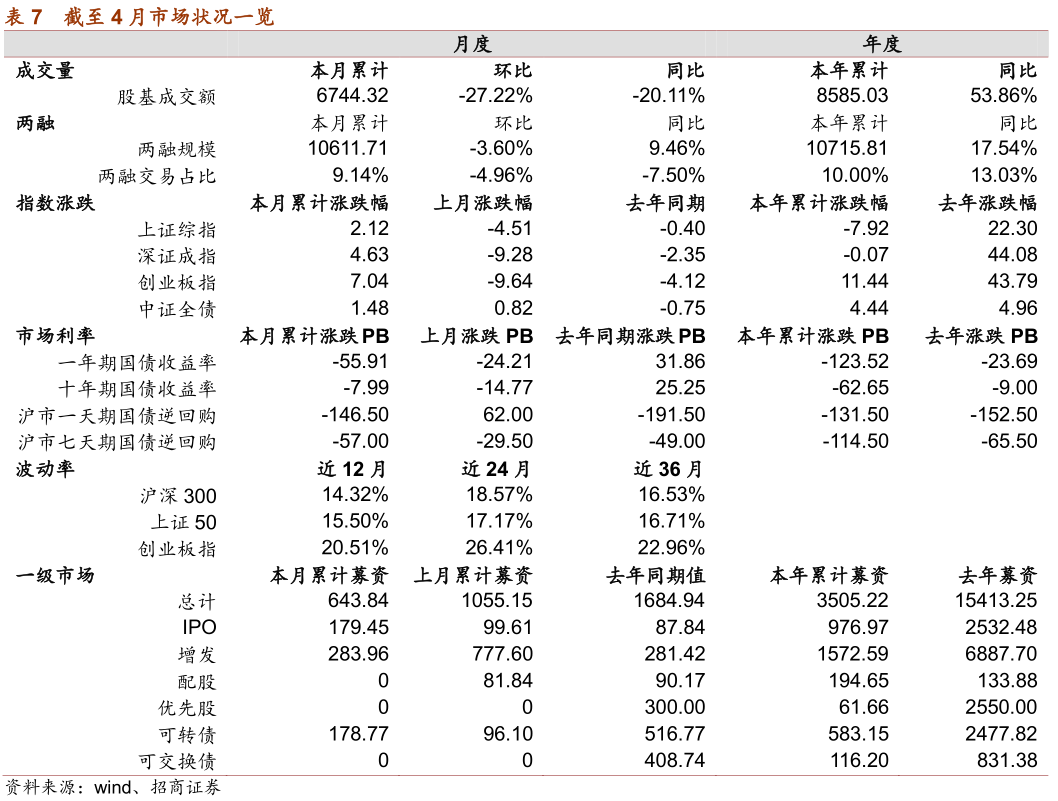 投资建议:维持证券行业推荐评级。在资本市场深化改革新周期下,行业政策持续发力,行业进入新一轮政策驱动创新周期。行业龙头在政策红利加持下,将会拉大与其他竞争对手的竞争优势,股价上也将长期享受估值溢价。流动性方面,催化刺激如期加强,4月20日的LPR报价如期下调20BPS,且后续刺激有望进一步加强,余额宝等货基迈向“1%时代”,货币政策正逐步走向“实质性”宽松和“名义式”宽松相结合的阶段。个股推荐:强烈推荐行业龙头中信证券(06030)和市场活跃度提升最为受益标的东方财富。