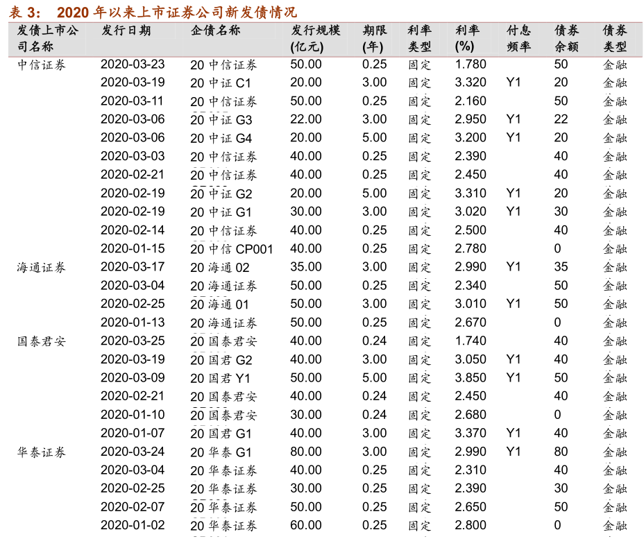全年证券公司负债成本下降趋势有望延续。2018年中以来,证券公司负债成本持续走低。2019年,证券公司全行业平均负债成本约4%,较2018年下降约1个百分点;其中上市券商为3.7%。今年一季度上市券商新发债务融资成本已经进一步下降至2.8%。按照3500亿新发债务规模估算,成本降低0.9个百分点对应提升上市证券公司全年32亿净利润,对应一季度净利润占比3%。