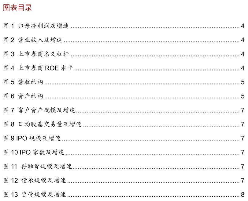 业绩概览:环比提升、同比下滑。38家上市券商合计归母净利润合计313亿,环比+46%,同比-19%。去年一季度权益市场火爆证券公司业绩高基数,今年3月权益市场大幅波动对券商业绩产生负面影响。结构上看,投资收益继续占比最高,但同比环比均为负贡献;经纪业务弹性最大,占比与投资接近。行业总体利润规模格局稳定,ROE表现分化加剧,前五券商年化ROE超越10%,后五券商单季度ROE不足1%。