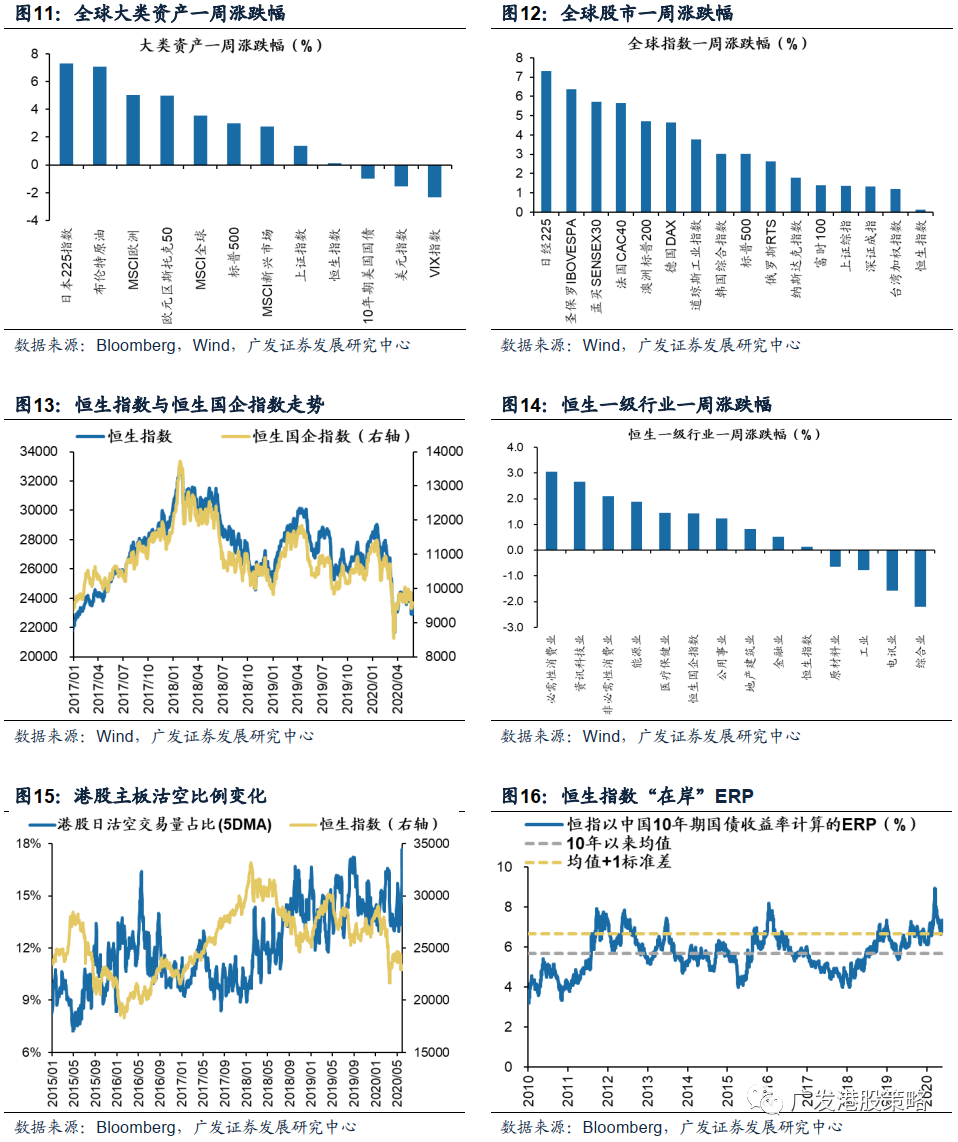宏观流动性与估值:跟踪本周(5.25-5.29)人民币兑美元汇率小幅贬值,10年期美债利率0.65%,中美利差走阔至206BP。WTI原油价格上涨至35.5美元/桶。恒生指数PE 9.35倍,低于历史均值水平。