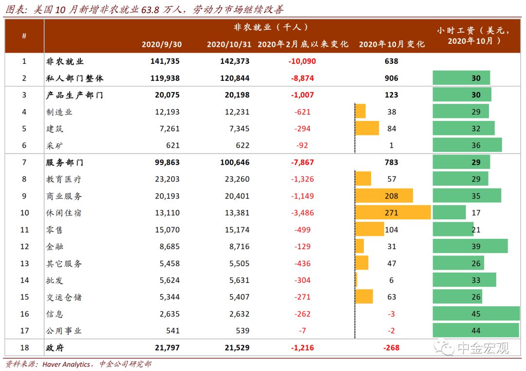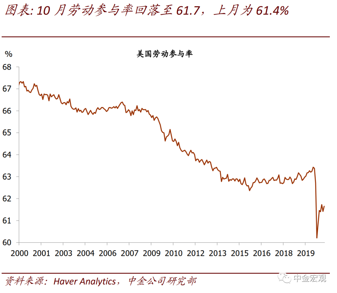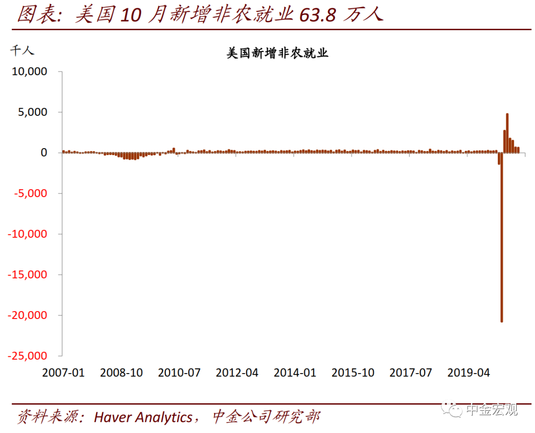 1. 10月新增就业高于市场预期。10月私人部门新增就业达90.6万人,相比上月的89.2万略有加速;但政府部门就业减少26.8万人,造成一定拖累。整体看,此前3~4月封锁期间,美国共有2216万人失去工作;解封后的5~10月,就业共回升1207万人,也即公共卫生事件冲击造成的失业中已有54.5%重回工作。