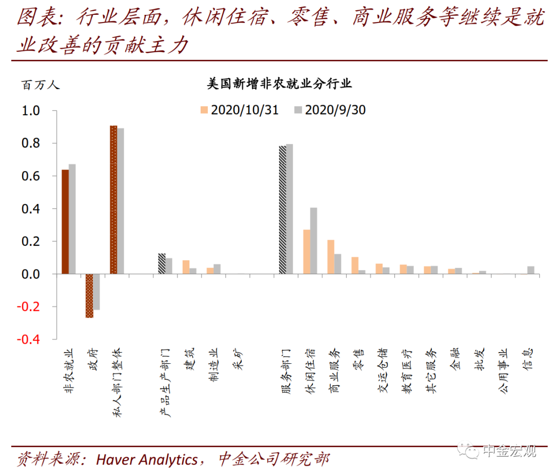 2. 接触性服务业继续是改善主力。10月服务业继续是新增就业主力军,共增加78.3万人。其中,休闲住宿(27.1万)、商业服务(20.8万)、零售(10.4万)增加较多。不过这些接触性行业就业水平依然明显低于2月时期;尤其是休闲住宿行业,依然相比2月低349万人。产品生产部门中,制造业新增就业3.8万,建筑业新增8.4万。不过,制造业就业依然较2月时期低62.1万人。