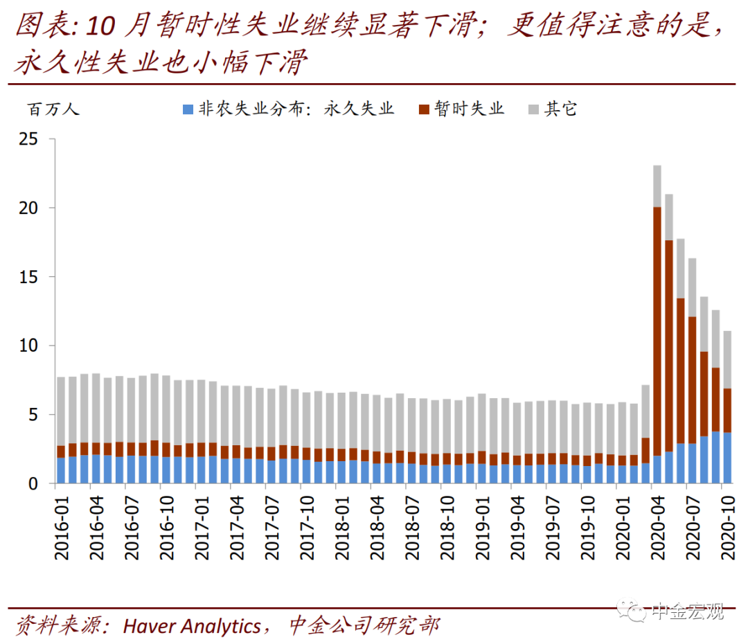 4. 10月失业率回落至6.9%,好于市场预期的7.7%;永久性失业下降。此前4月失业率为14.7%,为二战以来最高,随后5月回落至13.3%,6~10月延续了这一回落趋势,10月失业率为6.9%。从家庭调查公布的失业人数变化构成看,10月失业率人数共下降152万,其中虽然依然主要是受临时失业减少推动(10月减少143万),但永久性失业见顶回落也做出一定贡献(10月减少7.2万)。
