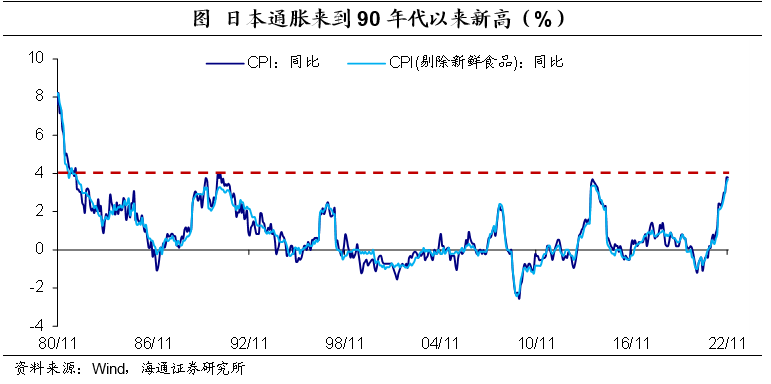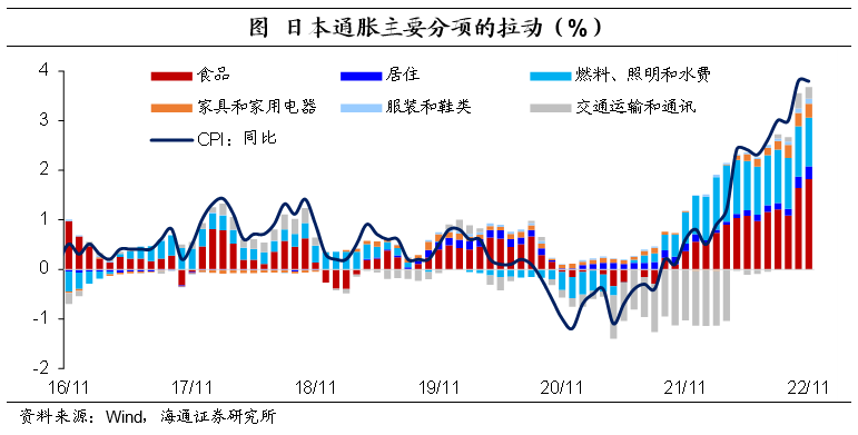 相比之前的YCC区间的调整,本次调整的幅度是比较大的。那么,日本央行为何“破防”呢?通胀的压力是非常重要的底层原因。在1999年以来的20多年的时间内,日本超过65%的时间通胀水平都在0%及以下,接近5成的时间通胀水平为负。这也是日本持续采取宽松货币政策的关键所在。但当前日本则面临着较大的通胀压力。截至2022年11月,日本CPI同比已经上行至3.8%,为1991年以来新高;日本央行长期盯住的核心CPI同比(通常是剔除新鲜食品)也上行至3.7%,为1981年以来新高,已经连续8个月稳定在2%以上,连续3个月稳定在3%以上,持续超出日本央行的目标水平。即使是考虑剔除食品和能源后的通胀也高达2.8%,为近30年以来的高点。从结构来看,除交通运输和文化娱乐外,日本各分项通胀都有明显的上行。其中,商品通胀达到了80年代以来的新高,服务通胀也上行至2015年以来新高。日本日益增长的通胀压力,促使日本国债收益率面临着明显的上行压力。