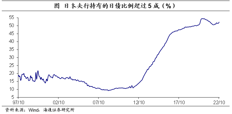 日本央行的“破防”,意味着宽松政策有所逆转,那么之前受益于宽松政策的资产或将面临调整压力。最直接的冲击,是对日本债券市场。自2013年日本央行开启QQE以来,日本央行持有日本国债的份额持续攀升。截至2022年10月,日本央行持有日本国债的份额超过5成,是日本国债的最大投资方。与本轮不同的是,过去2轮YCC政策调整并未引起债市的大幅波动,反而是本轮调整,日本国债利率大幅上行,背后主要是日本通胀压力的大幅抬升。