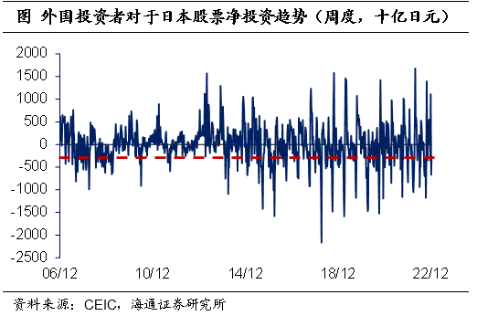 从外国投资者来看,资金在持续流出。根据日本财务省公布的周度数据显示,在去年12月20日调整YCC政策后,12月18日-12月24日当周,外国投资者净卖出日本股票2651亿日元。而债市净卖出规模更大,12月18日-12月24日当周,外国投资者净卖出日本中长债48623亿日元,为2005年有数据统计以来新高。此外,日本国内投资者也在这一周净卖出日本中长债4595亿日元,连续3周净卖出。
