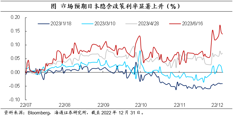 我们在报告《2023:货币与通胀,能否“和解”?》中指出,对于日本央行来说,有两个选择,一个是继续维系YCC,不再上调利率上限,等待通胀能够自然回落。但这样短期内市场对日本国债的需求依然低迷,市场抛售或难停止,而日本央行将不得不继续加大购债,压力持续集聚。另一个选择是日本央行继续上调利率上限,甚至在2023年有放弃YCC的可能性,但这样做的冲击是巨大的。上文我们已经分析过,日本央行货币政策的调整将对各类资产价格以及金融机构产生较大的影响。例如,截至2022年9月底的半年,日本央行持有的日本国债已经出现了8700多亿日元的亏损。当前市场预期日本央行未来将继续调整YCC政策,例如,10年期日元OIS利率仍然持续高于日本10年期国债利率;且截至去年年底,市场也预期日本隐含政策利率水平大幅上行。
