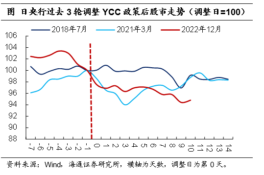 日本股票市场也会受到一定的冲击。一方面,日本央行自02年开始不断买入股票类相关资产,目前已经占日本央行总资产的5%以上,一度成为日本股市的最大投资者。低利率环境,再加上日本央行的持续购买,促使了日经指数的不断上行。因而,一旦宽松政策有所逆转,股市也面临调整压力。回顾过去几轮YCC政策调整,股市都出现下跌。而此次调整后,日经225指数在当日便大跌2个多百分点;截至1月5日,日经225指数较YCC政策调整前下跌了5个多百分点,高于过去几轮同期水平。