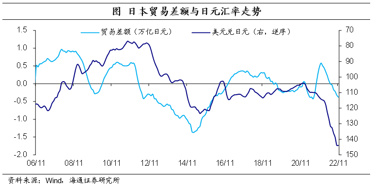 日元汇率大幅贬值也是触发的重要原因。2022年以来,在美联储持续偏鹰的背景下,全球主要经济体纷纷加息,而日本依然维持超强的宽松政策,汇率面临较大的贬值压力。在2022年10月中旬,日元对美元汇率一度跌破150,较年初贬值了30%多。而为了维护汇率,日本外汇储备也下降至2011年水平。汇率的大幅贬值其实也增大了日本的通胀压力,日本输入型通胀压力加剧,例如,日本PPI进口价格指数一度上升至49%,为80年代以来的新高,日本贸易逆差持续扩大。