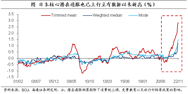 日本央行后续货币政策变化的关键仍是日本通胀。当前日本通胀已经来到近40年来新高,核心通胀来到历史高位。尽管日本央行一再强调通胀压力主要来自原材料价格的上涨,日本工资收入没有明显抬升,但欧元区的通胀压力主要也不是来源于需求,而是来自原材料价格的上涨和供给端的约束。此外,日本央行行长黑田东彦在12月26日演讲称,日本的劳动力市场状况预计将进一步收紧,企业的价格和工资设定行为也可能会发生变化。日本正处于打破泡沫经济破灭以来长期低通胀、低增长的关键时刻。根据日本央行测算,截至去年11月,日本核心潜在通胀也已经上行至历史高位,无论是通过截尾平均测算,还是加权平均测算,均是如此。日本面临的通胀压力或持久。