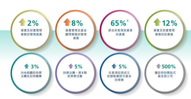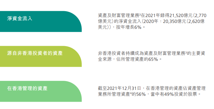 非香港投资者继续成为资产及财富管理业务的主要资金来源,占管理资产65%。资产及财富管理业务从业员总数上升12%,达5.4万人。