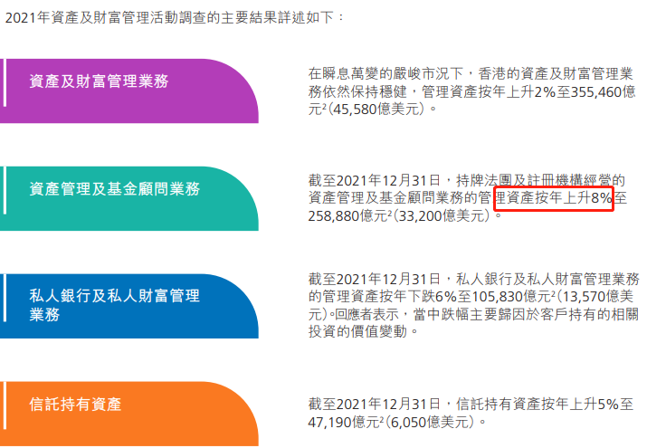 香港证监会去年7月发表的调查报告称,截至2021年底,香港资产及财富管理业务的管理资产同比上升2%至近35.55万亿元(港元,下同)。2021年资金净流入逾2.15万亿元,增长6%。持牌法团及注册机构经营的资产管理及基金顾问业务所管理的资产上升8%,至近25.9万亿元。