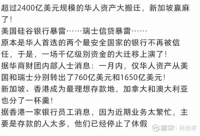 近日有传言称(见下图),瑞士信贷破产前后短短两周,有超过760亿美元和1650亿美元的资产从美国和瑞士撤离,主要流入香港和新加坡。