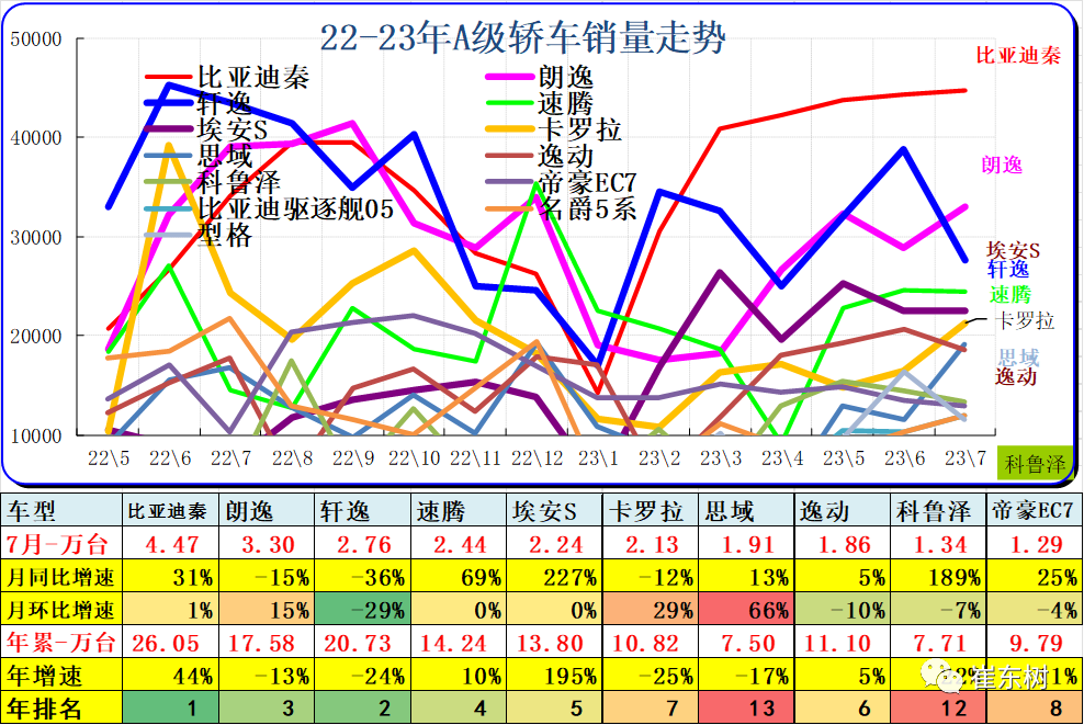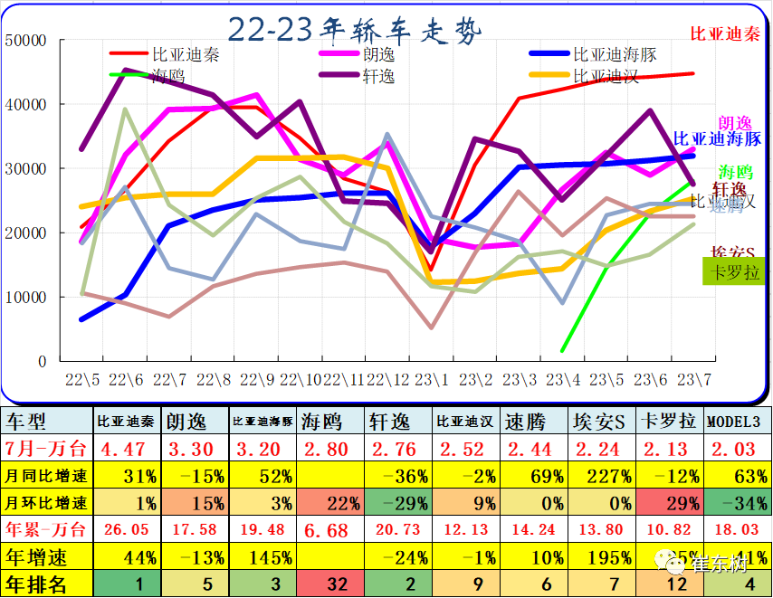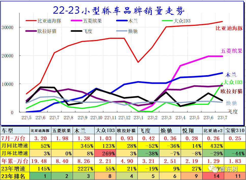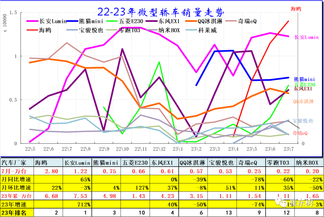 A0级轿车2023年7月批发10.66万台,占轿车批发份额11.71%,批发较去年同期同比增长36%,批发环比今年上月增长6%;2023年7月零售较去年同期同比增长12%, 零售环比今年上月增长4%。2023年1-7月批发数量63.22万台,厂家批发销售累计增幅68%;2023年1-7月国内零售数量43.24万台,零售累计增幅50%。