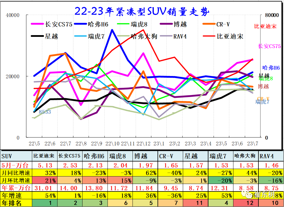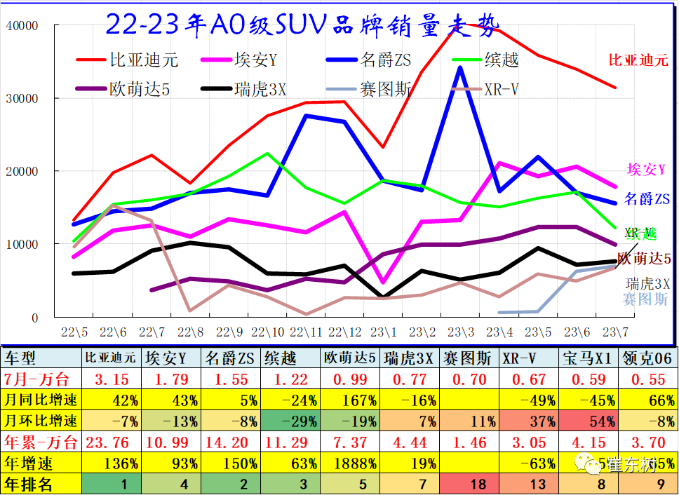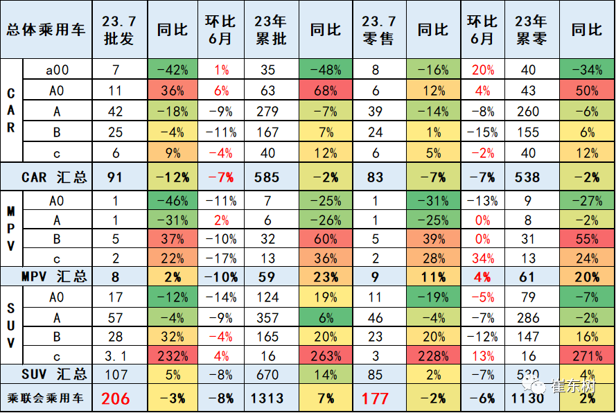 A0级SUV 2023年7月批发16.77万台,占SUV批发份额15.7%,批发较去年同期同比下降12%,批发环比今年上月下降14%;2023年7月零售较去年同期同比下降19%, 零售环比今年上月下降5%。2023年1-7月批发数量124.3万台,厂家批发销售累计增幅19%;2023年1-7月国内零售数量78.88万台,零售累计下降7%。