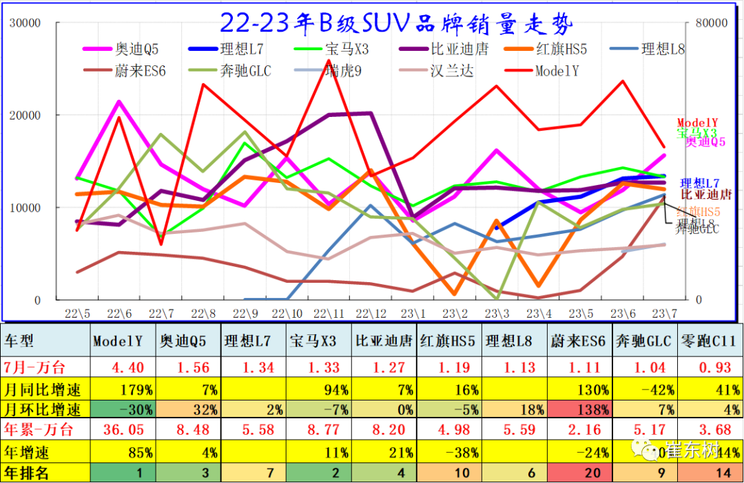 B级SUV 2023年7月批发市场仍是电动车领军,燃油车是奥迪、宝马较强,而豪华车在未来政策促进下仍会有较好表现。